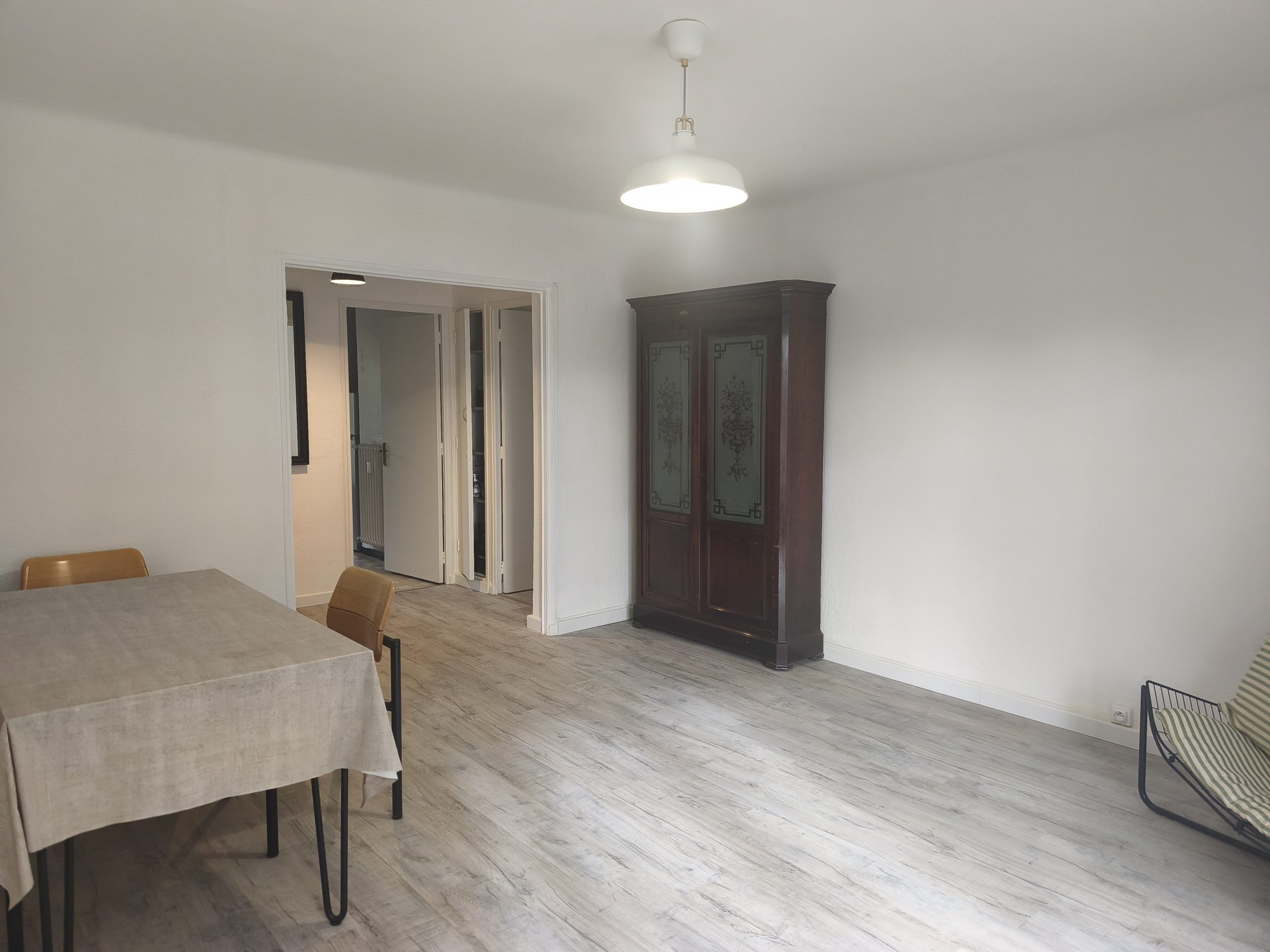Appartement rénové, parquet flottant au sol, cuisine aménagée ( gazinière, lave vaisselle, machine à laver, frigo/congel), chauffage collectif, stationnement dans la rue, ou quelques places collectives.