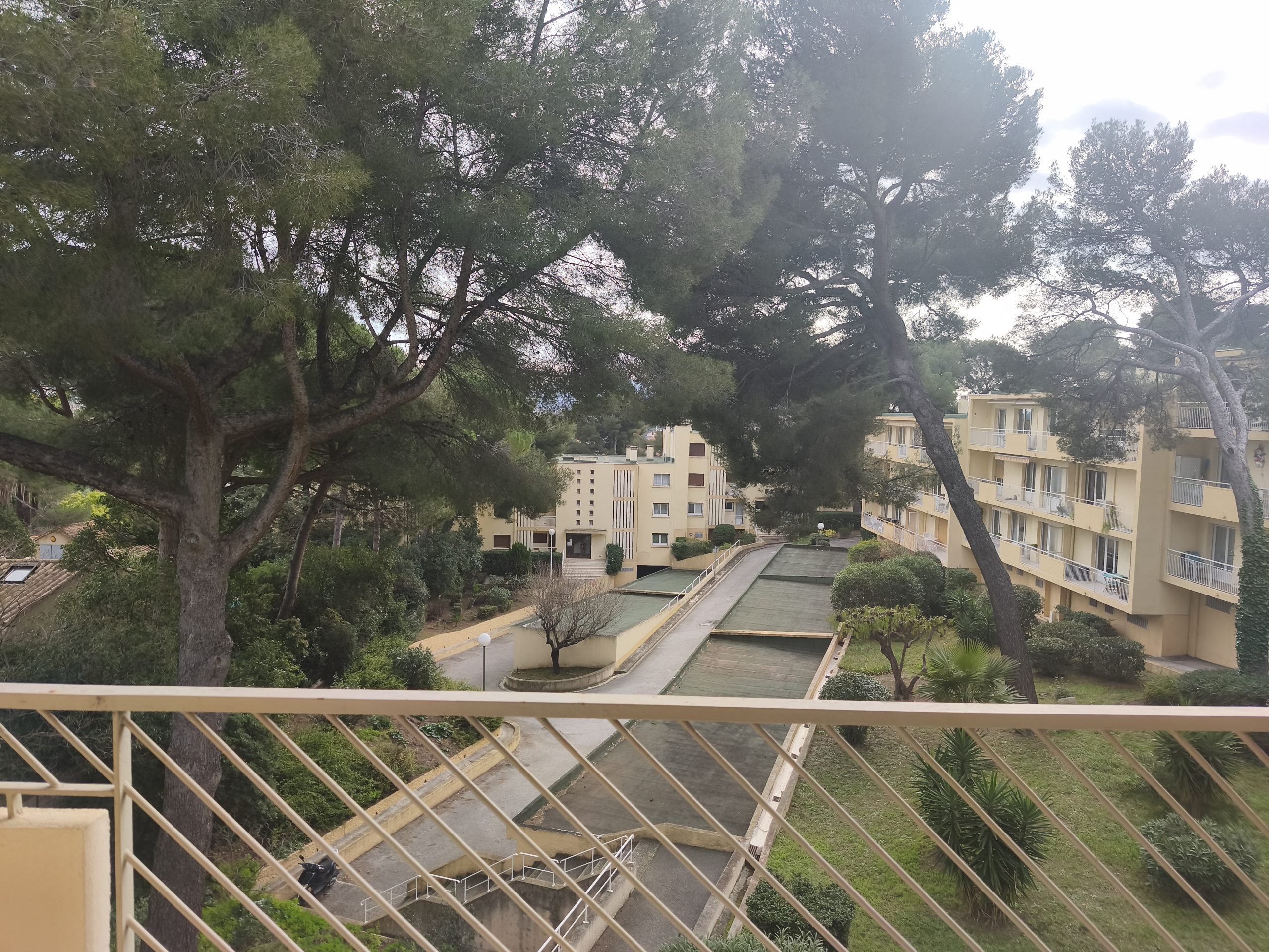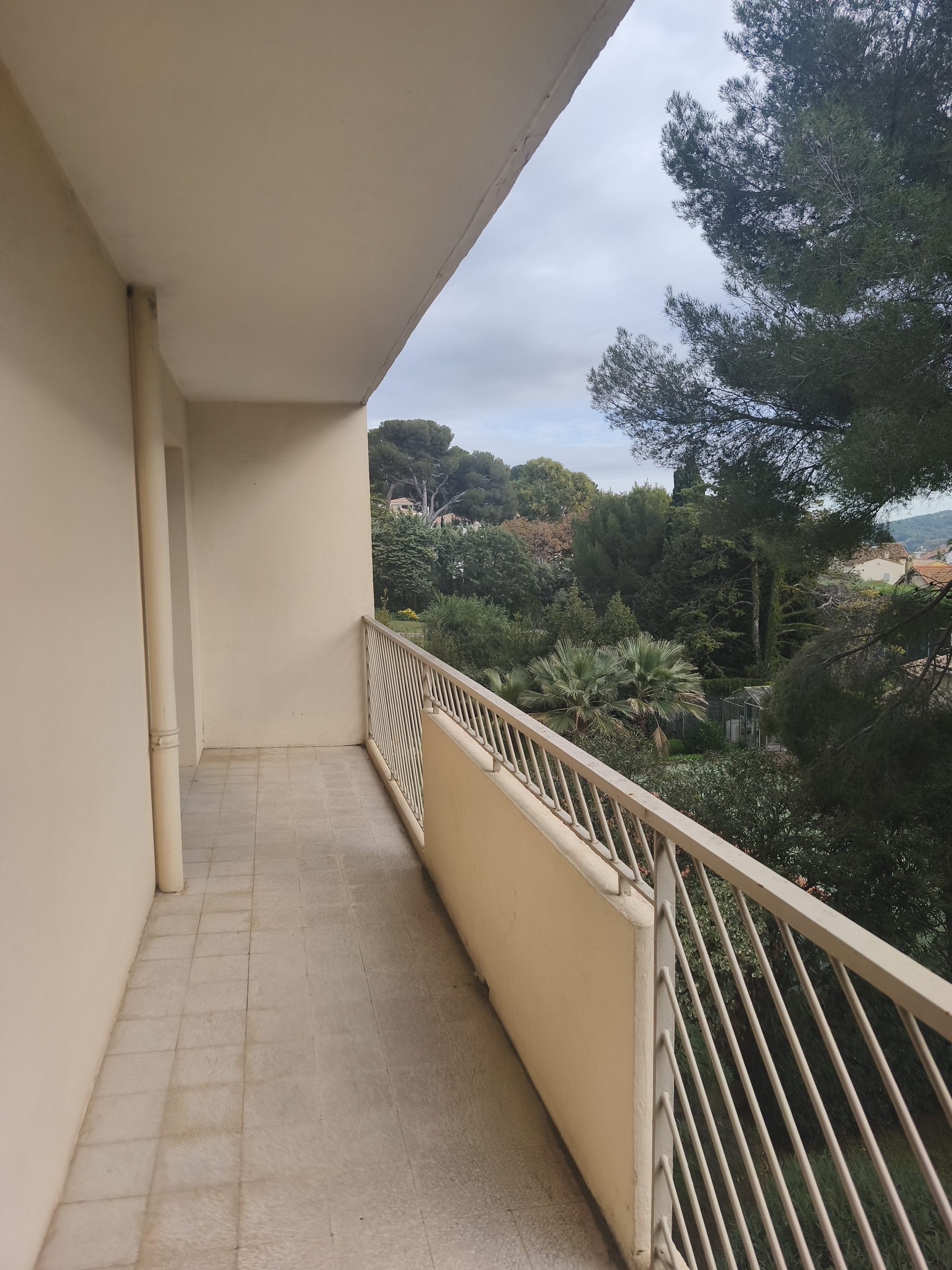 Entrée, séjour donnant sur balcon filant avec vue dégagée sur les jardins de la copropriété, cuisine séparée, aménagée et équipée avec balcon arrière, dégagement desservant deux chambres avec placard, dont une donnant sur le balcon, salle de bains, wc séparé.